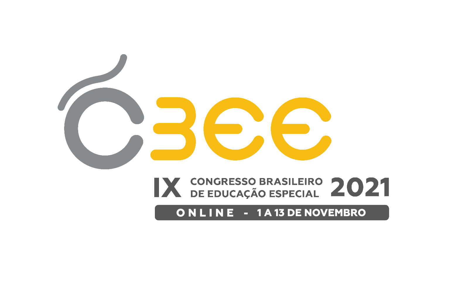 Descrição da imagem (logo com cores Cinza e Amarela): CBEE. Nono Congresso Brasileiro de Educação Especial. Online. 1 a 13 de Novembro de 2021. Sigla: CBEE escrita em letras esféricas. Na cor cinza a letra C tem, em sua parte superior esquerda, um traço ondulado, em formato do acento til, disposto na direção inclinada da esquerda inferior para a direita superior, fazendo alusão a uma visão lateral do tronco de alguma pessoa que utiliza cadeira de rodas. Assim: o Til seria o Tronco do sujeito e a letra C seria a cadeira de rodas. Em Amarelo, as letras B, E, E. Em letras cinza o nome do congresso e o ano e, sobre uma faixa cinza, letras brancas que indicam a modalidade e o período do evento.